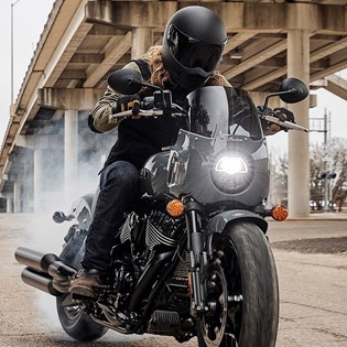Mini-apehanger-styr parret med fremrykkede fodhvilere giver en mere opretsiddende kørestilling på Chief Bobber Dark Horse, hvor stellet hviler på 16" trådegerfælge. Forlygten er større, og der er tilføjet bælge på forgaflen og dæksler på bagstøddæmperne. Chief Bobber Dark Horse fås i farverne Black Smoke, Titanium Smoke, eller Sagebrush Smoke.