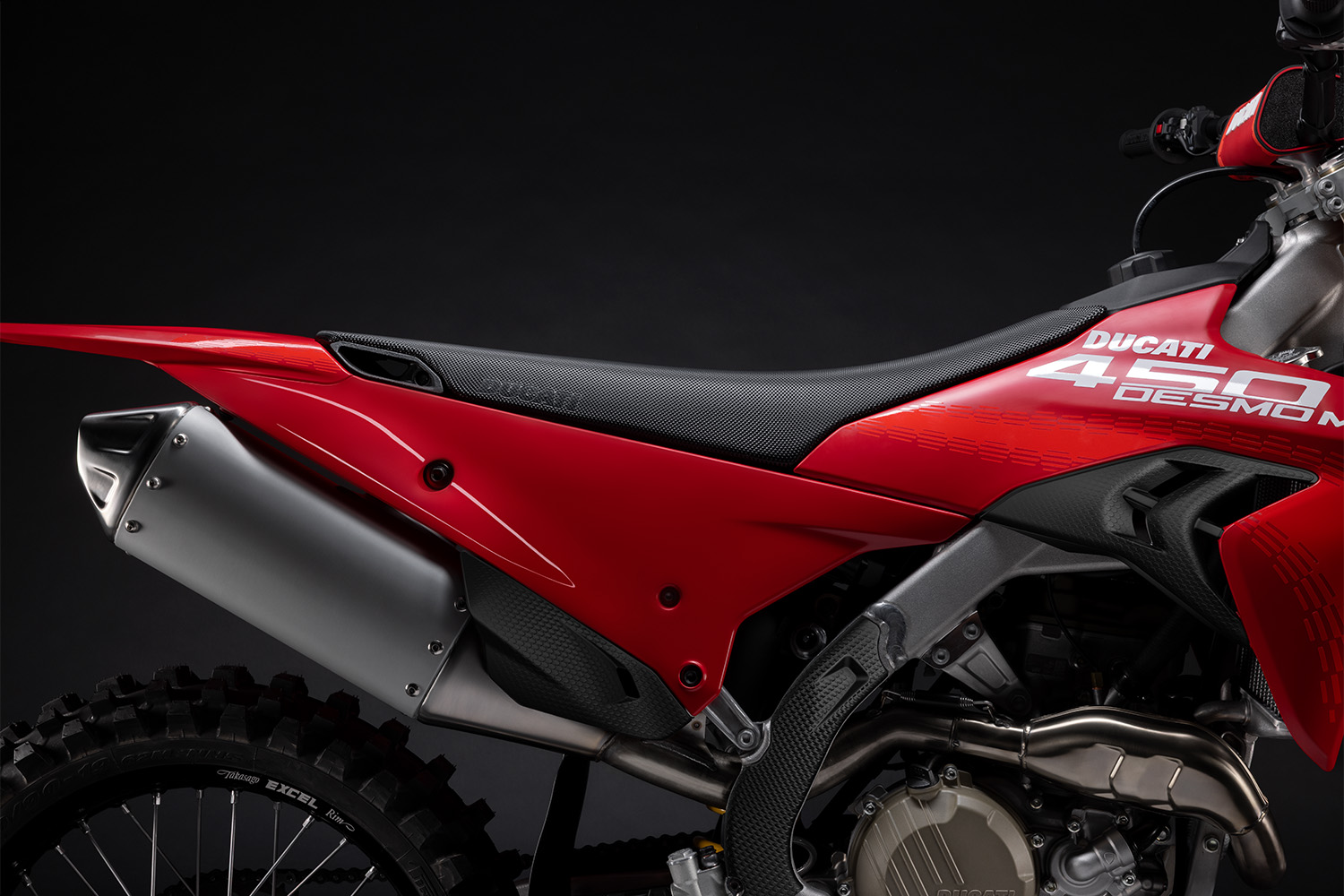 Ducati indtager motocross-scenen med et brag af en éncylindret motor i Desmo450 MX, som med desmodromisk ventilstyring yder 63,5 hestekræfter ved 9.400 o/min fa 449,6 kubik. Énstamperen rammer først det røde felt ved 11.900 o/min, hvilket ifølge Ducati sætter ny standard i kategorien.