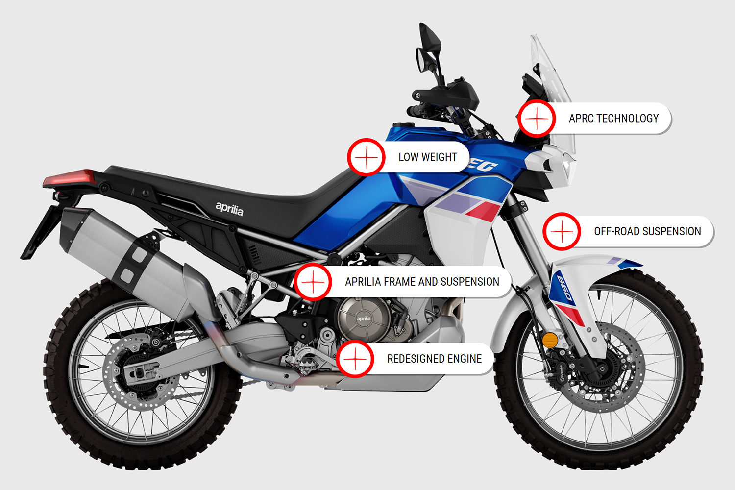Motoren er den samme tocylindrede række-enhed, der også findes i Tuono 660 og RS 660, men i Tuareg er den redesignet til at prioritere bund- og mellemområdet, så den nu leverer 80 hk og 70 Nm. TFT-skærmen på 5" og elektronikpakken med fire køreprogrammer, traction-control m.m. er også udviklet fra de andre 660'ere, men her stopper lighederne.