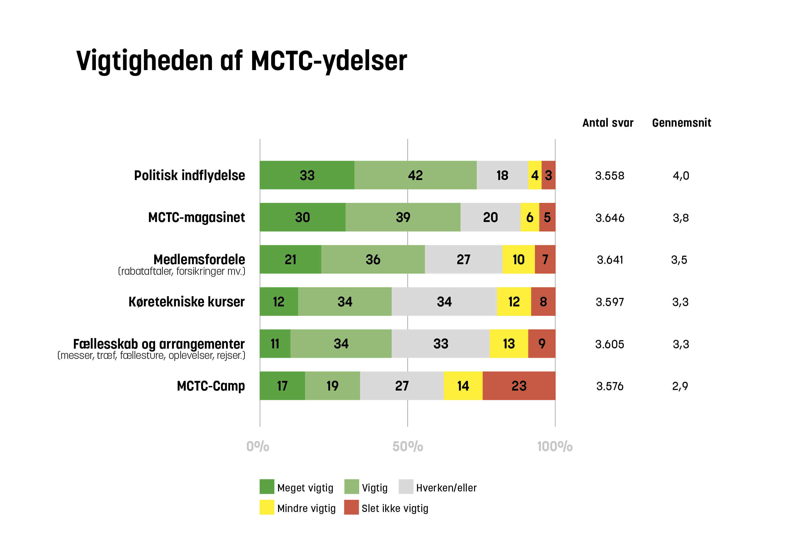 Tusind tak til de 3.621 medlemmer, der har taget sig tid til at give os et indblik i, hvordan tilfredsheden er blandt MCTC's medlemmer. Så mange besvarelser giver os meget valide data, som vi kan bruge til at forme retningen for foreningen og dens aktiviteter fremover.